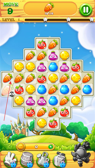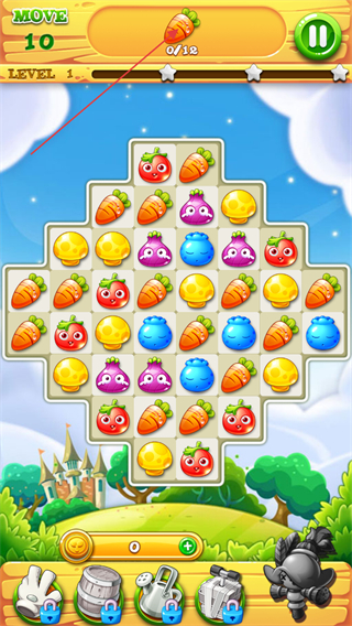 3、通过划动屏幕交换两个蔬菜的位置,让同样的三个以上的蔬菜进行消除。