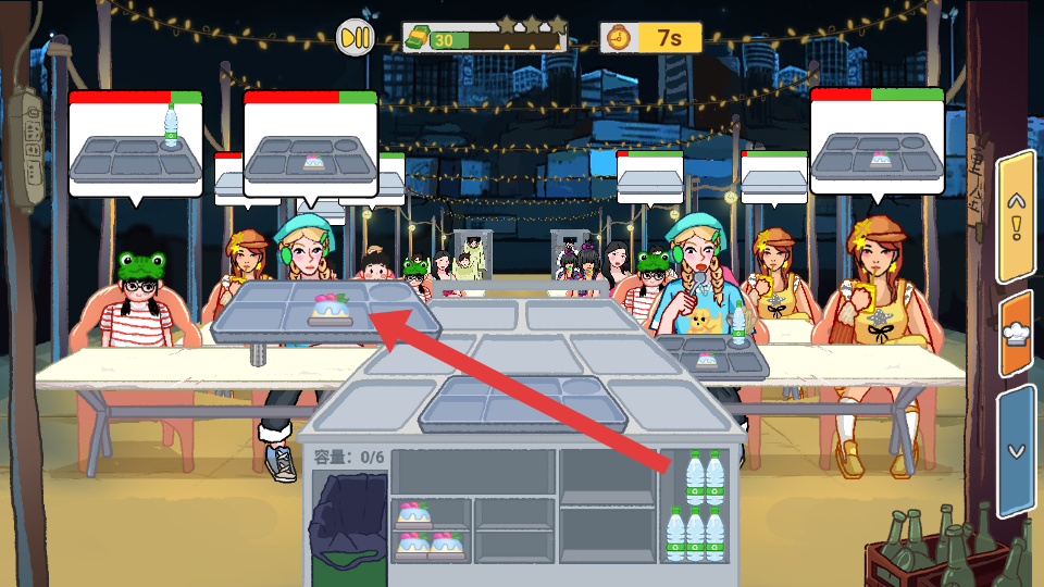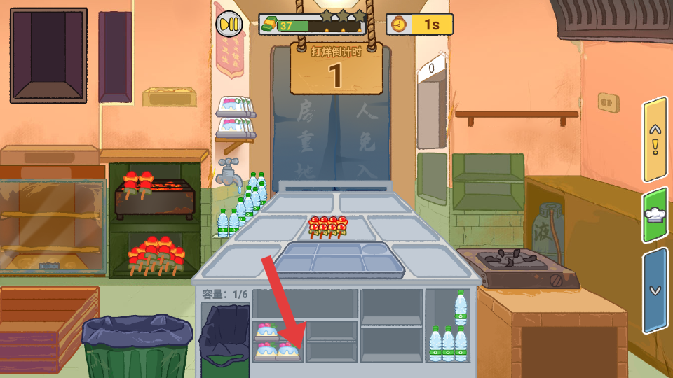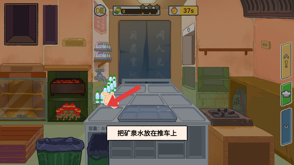 1、在游戏中,按照提示将矿泉水放置到推车上,食材准备的基础操作,后续服务顾客做好准备。