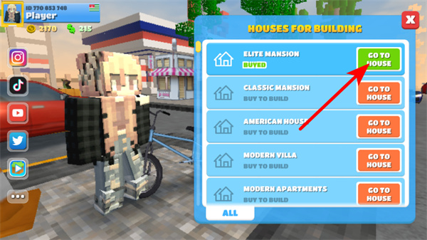 2、打开建筑界面后,选择已解锁的房屋并点击GO TO HOUSE,可前往对应建筑区域,推进建设或解锁相关功能。