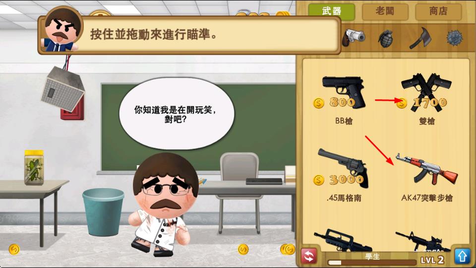 2、在武器界面,可消耗金币解锁双枪、AK47突擊步槍等武器,提升攻击能力。
