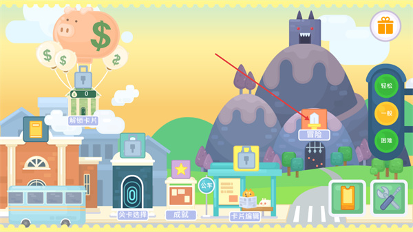 1、进入此界面后可通过解锁卡片获取新卡片,也能点击冒险按钮选择对应难度开启冒险,还可通过关卡选择等功能进行游戏相关操作。