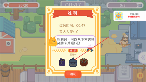 4、战斗获得胜利后,会出现奖励三选一的界面,选择对应的奖励卡片后,点击确认按钮即可领取奖励并结束该关卡。