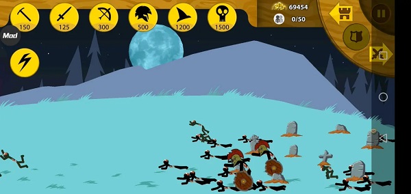 如果点击中间的盾牌按钮,火柴人士兵就会挡在基地前方,就算敌人过来了,也不会退缩一步,而是勇敢的上去与敌人厮杀。