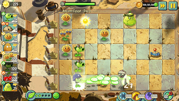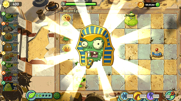 7、法老僵尸:不放大招,只有竹员外等可以一下打死满HP的法老僵尸,否则只能大火力或减速慢慢耗。菜问+坚果是不错的组合。