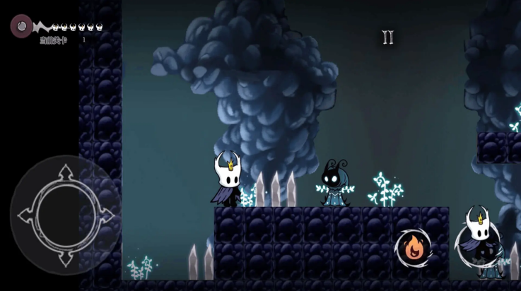 1、左右和跳起控制小小骑士,跳过悬崖,台阶等障碍,躲避藏在悬崖下的敌人。