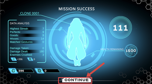 3、根据音乐节奏完成连续操作,成功通关后点击继续按钮,进入下一阶段任务流程。