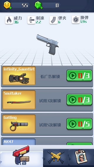 每次通关关卡还有新武器解锁,待进度条满时,即使不用解锁你也会有新的武器可以使用。