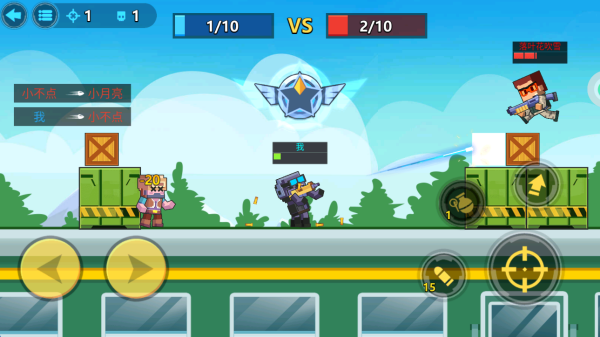 4、在对战中,左侧控制角色移动,右侧控制射击跳跃以及更换子弹。