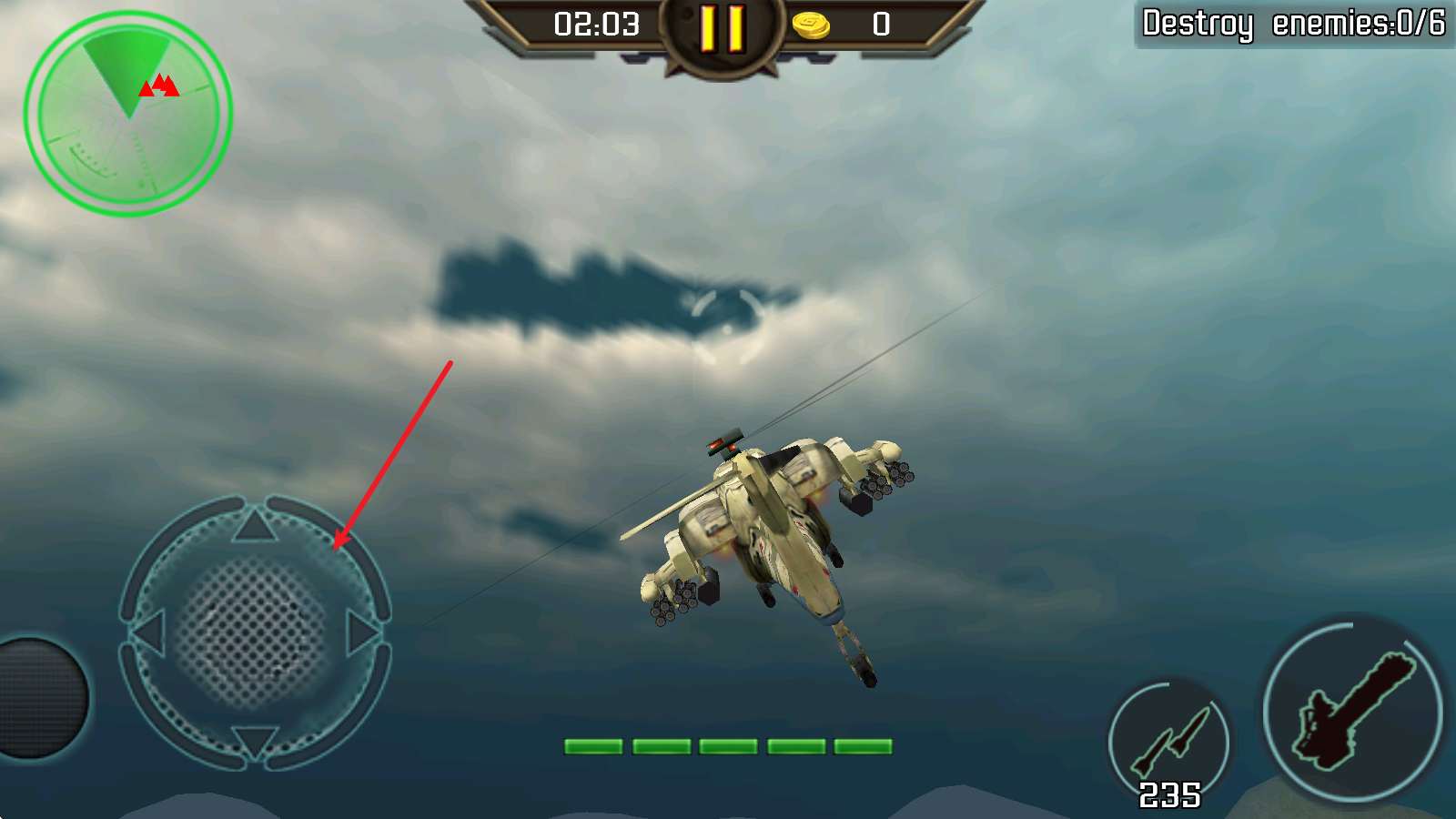 2、左侧的虚拟摇杆控制直升机进行移动。