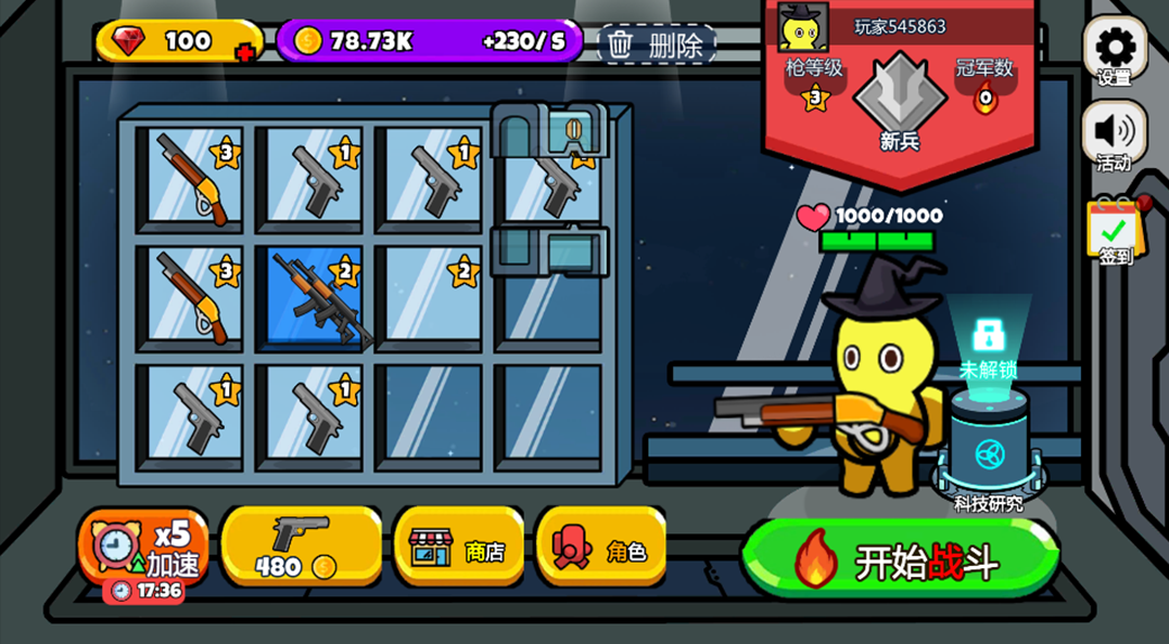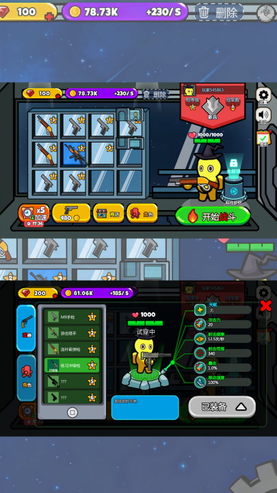 进入游戏,先到商店逛逛,用你积攒的金币,把各式各样的酷炫武器收入囊中。这里的武器可大有学问,只要把两个相同的武器放在一起,就能合成升级,解锁更厉害的新家伙。就像玩拼图一样,每一次合成,都能让你的火力更上一层楼!