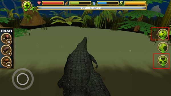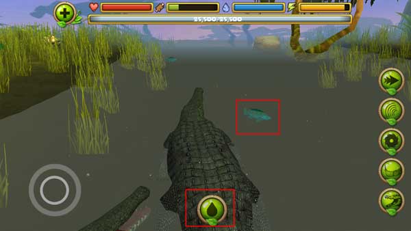 2、当鳄鱼进入到水中是会自动出现一个按钮,你需要捕食为你补充能量,需要小心附近其他的动物的侵害。