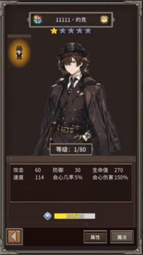 3、点击下方的角色按钮可以查看主角当前属性和能使用的魔法招式;