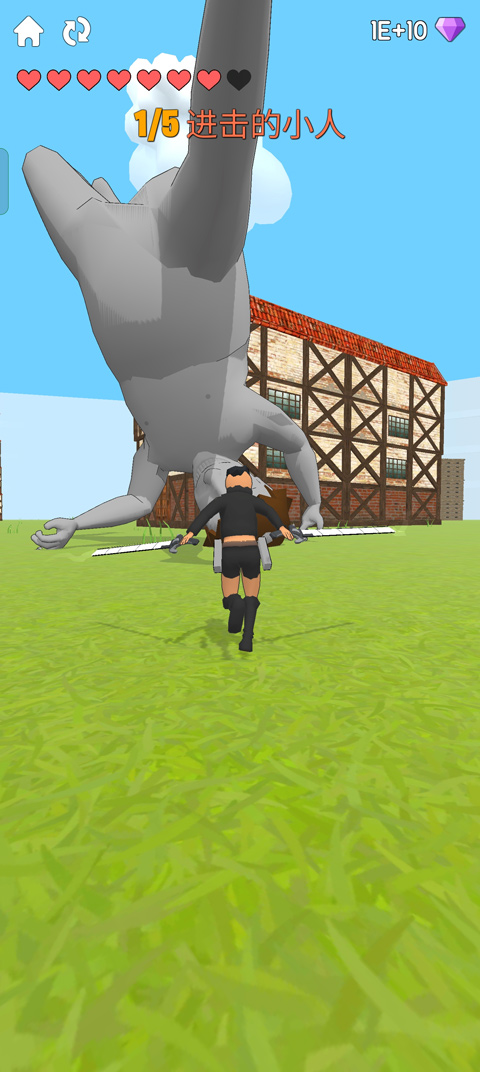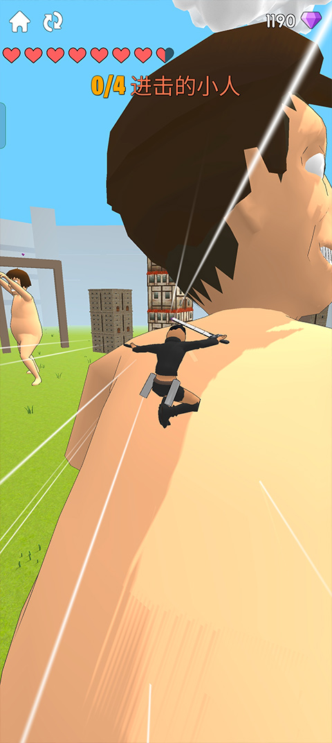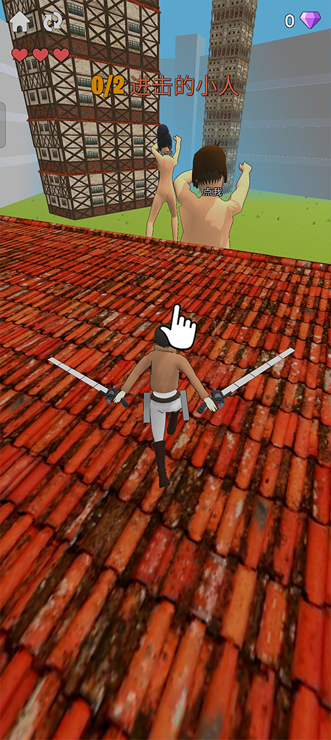 3、也可以点击点击屏幕中的建筑物或者点击巨人使用抓钩来接近巨人的脖子;