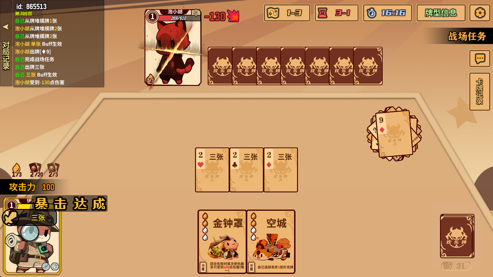 6、将手中所有的扑克牌打空之后,将会触发暴击效果。法术牌不计入其中。暴击可以强制获得回合胜利,并使打出的伤害增加30%。