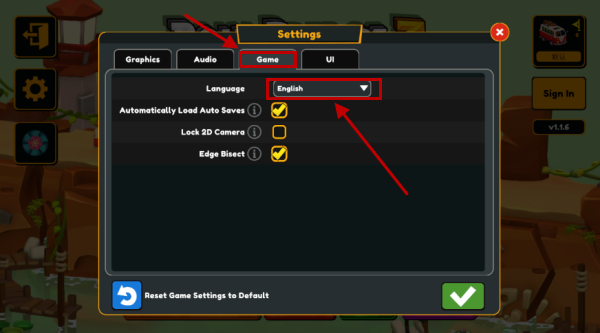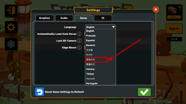 2、打开我们的设置界面后,需要在Game设置界面的Language语言选项中选择简体中文。