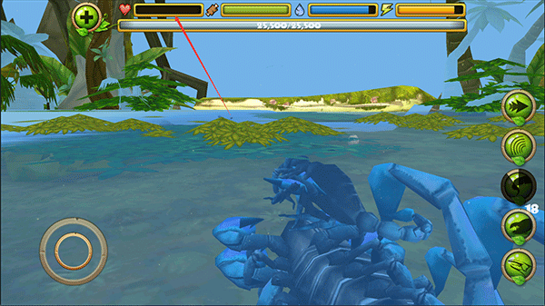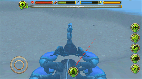 3、在探索的途中你可以攻击别的动物,如蜻蜓、鸟、蛇、青蛙等待,右侧按按钮由上至下分别是加速、眩晕、尾刺攻击、钳子攻击,吃;
