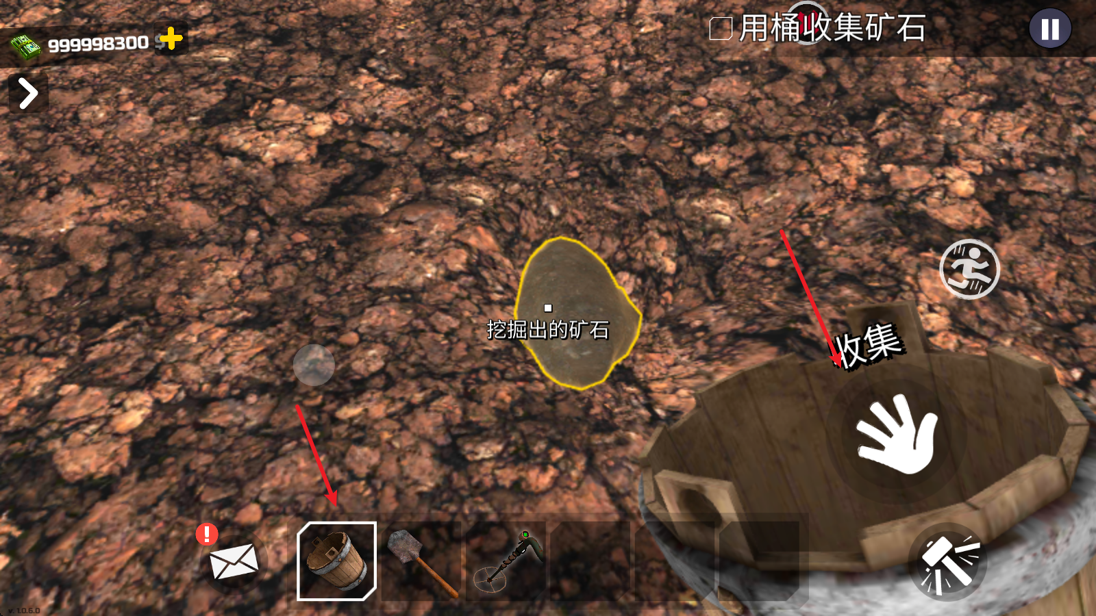 2、随后掏出铲子进行挖掘,直到矿石整个轮廓出现,我们就可以拿出桶将其装起来。