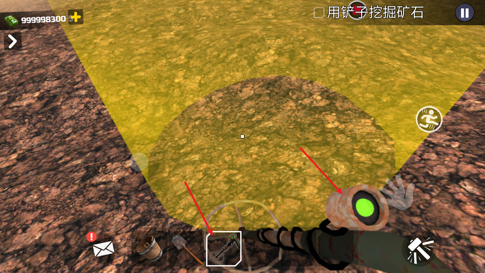 1、进入游戏后,我们首先拿出探测仪,四处寻找矿源,当上面绿灯闪烁时则代表周围有矿。