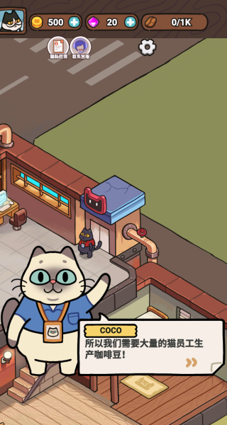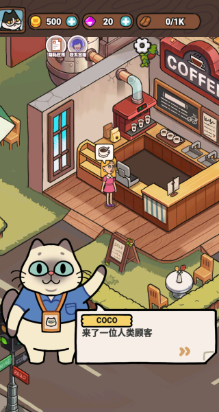 1、进入游戏后,你可以根据猫咪的指引去开业自己的猫屎咖啡店。