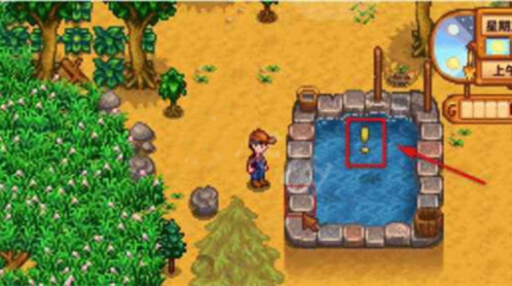 2、在鱼塘达到繁殖后会出现黄色感叹号,然后点击查看;