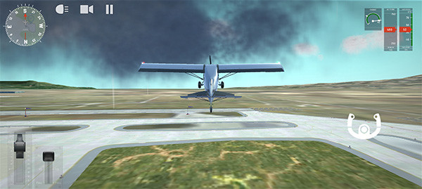 8、滑动右下角的方向盘按钮,向下拉进行起飞,起飞之后就可以控制飞机的上下左右了。