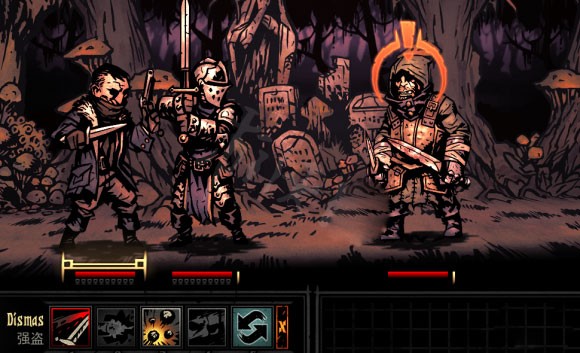 这张图上方的位置缩略图表示了,手枪射击必须站在2,3,4号位才能发动,且能也只能打到敌方的2,3,4,号位因此,在这场战斗中,强盗显然是没有任何办法使用他的手枪射击的(尽管没有使用的必要),下方的技能栏也人性化地显示为了暗色。