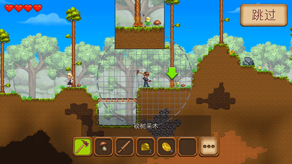 3、点击屏幕并按住以使用该物品,使用锄头物品可以砍树采木,挖掘有用的东西。