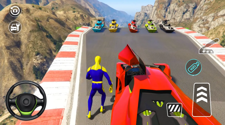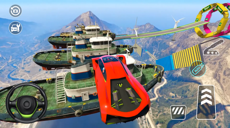 2、巨型坡道汽车特技:在巨大的坡道上执行大胆的特技。当你加速通过每个关卡时,在空中跳跃、翻转和旋转你的汽车。