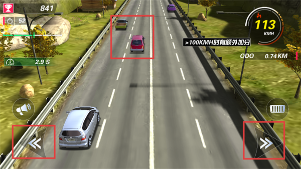 3、驾驶时通过左下角左箭头、右下角右箭头操控方向,躲避前方车辆确保安全。