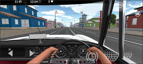 左上角第一个则是行驶的距离,中间则是时间计时,依次是生命值。若车辆发生碰撞则会损失一格生命值,右上方的图标信息依次是后视角,相机(视角切换),暂停和菜单按钮以及车辆内部的灯光、喇叭和转向灯。