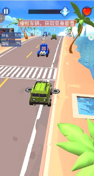 3、操控着你的车辆去与其他的车辆比赛,如果能摧毁其他的车辆,你就可以获取变身能量。