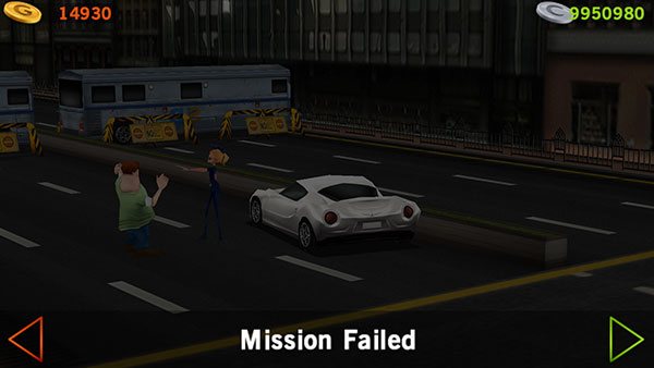 9、如果未能及时拨正方向盘,则很有可能�� 成【交通事故】,这时候游戏也就结束了,点击左侧箭头返回,右侧箭头继续。