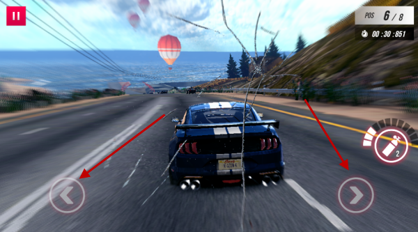 4、接着开始比赛吧,屏幕左右两侧各有一个按钮,是用来控制赛车的方向的,右方向键上方的按键点击一下还可以进行氮气加速。