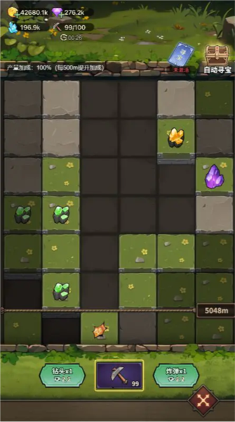 玩家使用镐头前往洞窟寻宝,每消耗一个镐头可消除洞窟障碍,消除到有资源的的地方,可获得资源(主要获取冥想晶石)。镐头未达到上限前会随着时间满满恢复,直到上限值。在消除洞窟障碍时,也可以使用钻头和炸弹,消除一大遍,获取更多资源。
