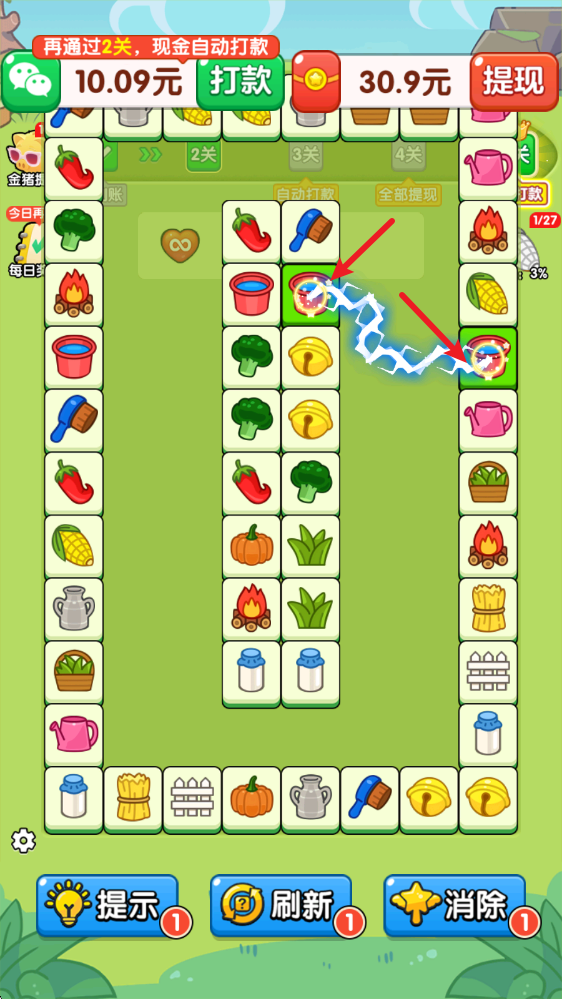 3、下面还有着提示、刷新和消除三种道具,可以帮助你更有效率的闯过关卡。