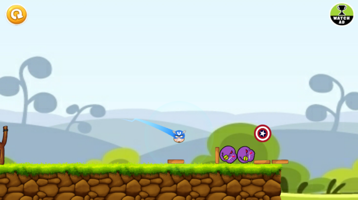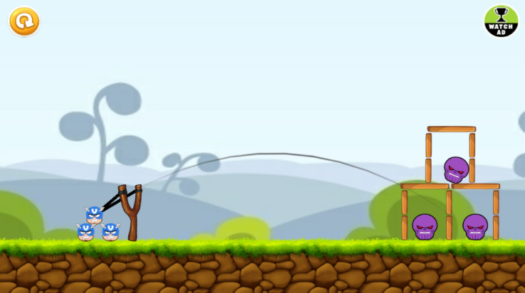 1、将弹弓上的超级英雄弹射出去,砸到紫色的灭霸,砸到全部灭霸就能通关。