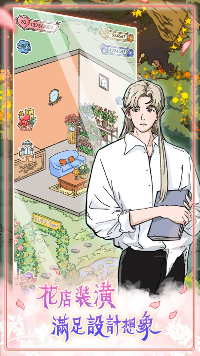 游戏中玩家可以花园种植,享受经营乐趣,种植不同种类的花卉,完成花店订单,收获金币和爱心,花卉被种植在空中小岛上,随着剧情发展,解锁不同的主题小岛;
