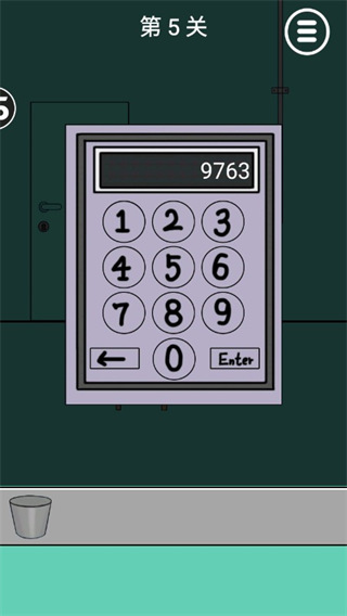 拿到桶子。用桶子去水龙头下接水。取回这桶水,点击下水道。把那个一桶水移到下水道上,看到密码(9763),输入进去密码锁,点击“enter”,开门。