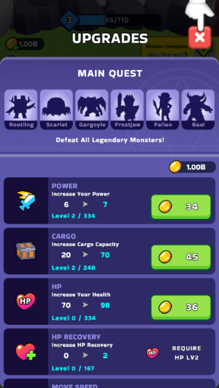 3、有了金币之后,我们可以去升级自己的属性了,点击左下角的升级按钮。