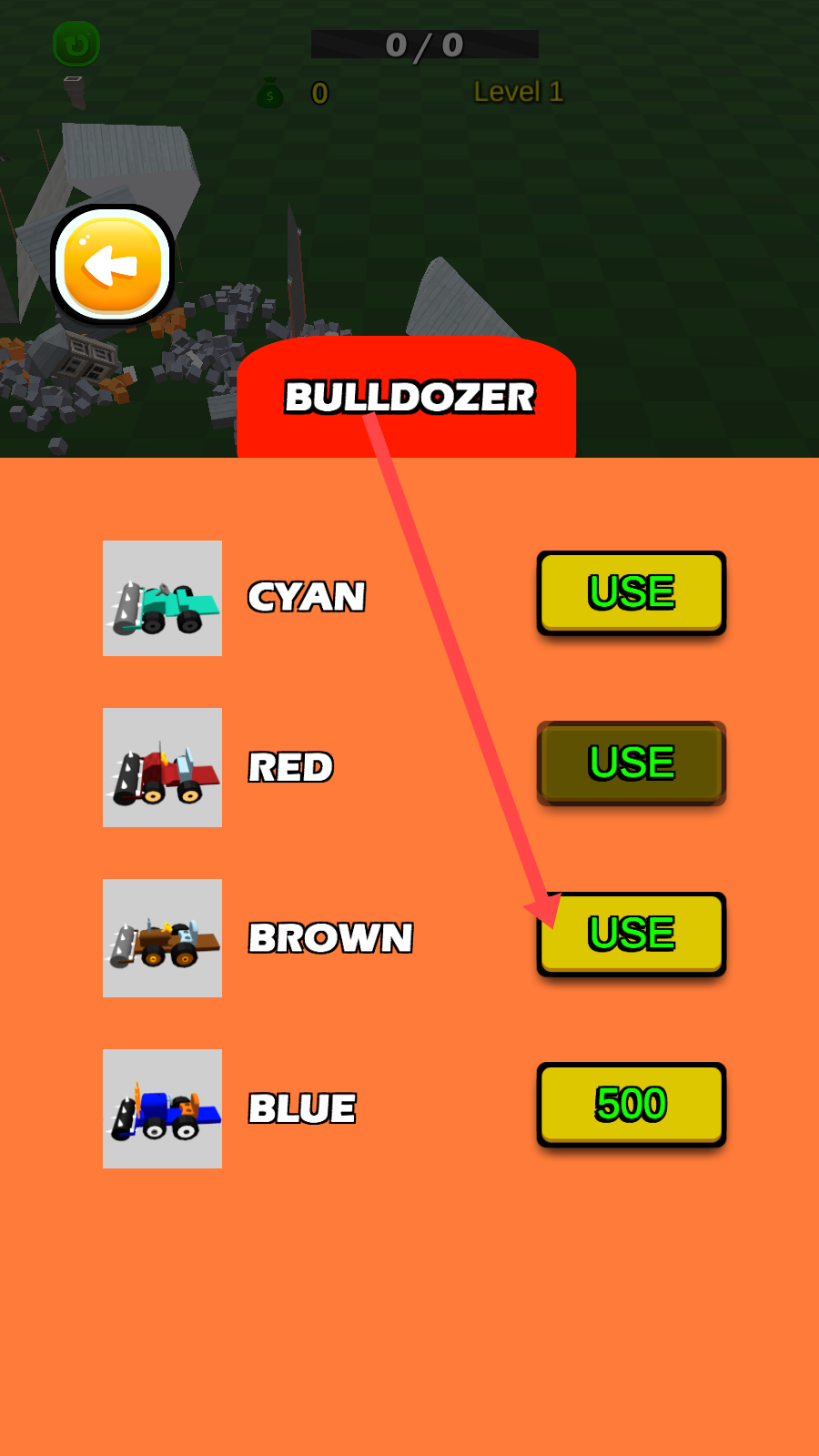 3、完成关卡后,可在推土机选择界面,点击不同颜色推土机对应的【USE】按钮(如BROWN推土机 ),更换推土机继续后续游戏。