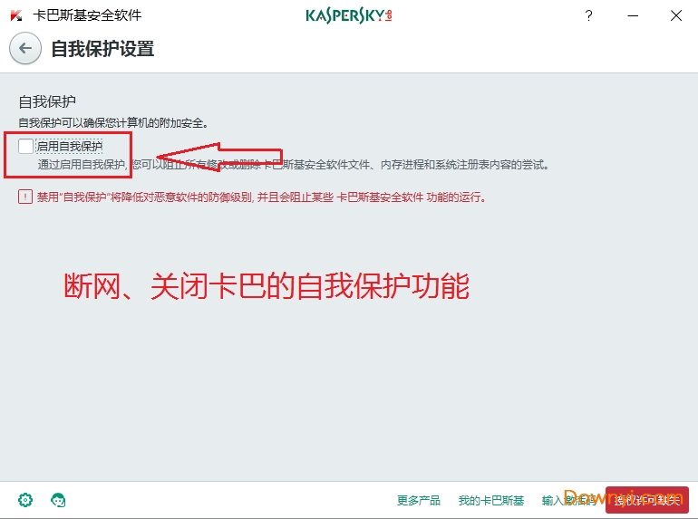 2、我们需要把卡巴斯基的自我保护关闭掉、不要忘记关闭掉网络/或者拔掉网线,如下图: