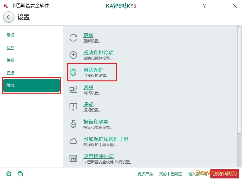 1、首先安装好卡巴斯基安全软件,在右下角设置里面找到【附加】【自我保护】如下图: