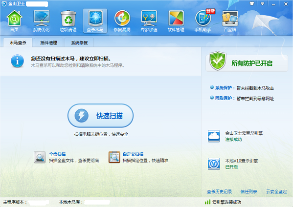 6.独家三引擎查杀木马:革命性云引擎技术,金山云引擎智能判断查杀上亿木马!全新本地V10引擎,完美清除感染型木马!
