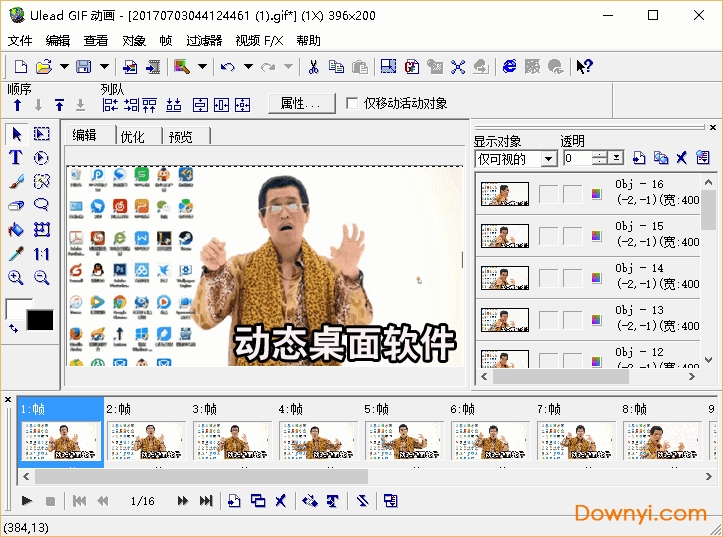 ulead gif animator(u5)在文字编辑器、选色器和选取工具上面都加强了各自的功能。同时转换器也相应的得到了增强,现在你已经可以随意调整对象的大小和角度了。