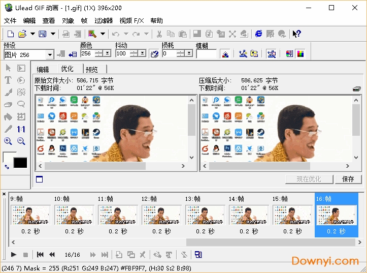 软件在图像压缩优化方面更完善,你可以利用有损压缩、抖动颜色、颜色索引编辑等等功能来进一步优化你的作品的输出效果,而这些操作都会即时可以看到预览效果。