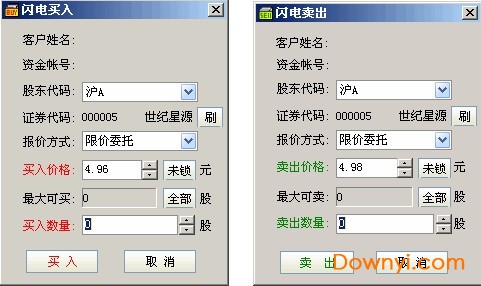 ▲ 在预警列表上双击“价位下破”或者“价位上破”的股票项,将弹出闪电卖出或者闪电买入的对话框,如下图: