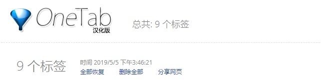 用chrome浏览器浏览网页时,因为页面还没有看完,或是需要反复查看等原因,而舍不得关闭页面,导致在chrome浏览器中出现了很多标签,这些标签不仅查找起来不方便,还会占用很多内存。如果电脑内存比较少,就可能会出现内存不足的问题。即使电梯内存很多,当开启了很多页面后,在众多的标签之间寻找页面也不是很方便,这时,可以使用onetab,将当前所有打开的标签页全部关闭,整合成为一个列表,显示在一个新打开的名称为"onetab"标签页中,查看全部标签也更轻松了。你可以点击恢复某个标签页,也可以全部恢复打开。