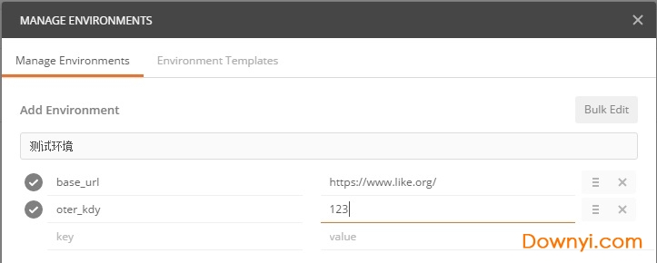 填写该环境的名称:如测试环境,并在key和value中填写需要的键值