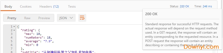 一个api的响应包含body,headers,响应状态码。postman将body和headers放在不同的tabs中。响应码和响应时间显示在tabs的旁边。将鼠标悬停在响应码上面可以查看更详细的信息。