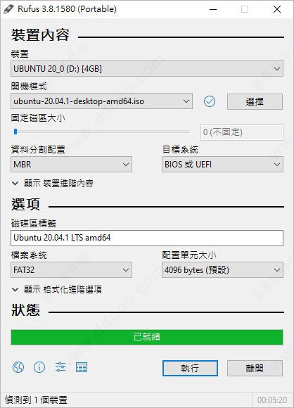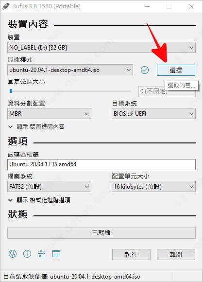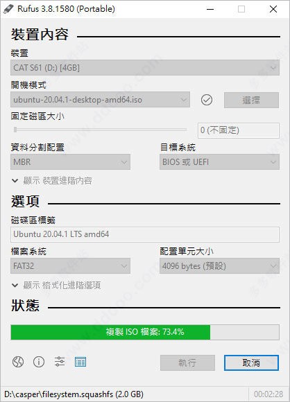 插入usb 并开启rufus 找到「选择」,找到刚刚下载的「ubuntu-20.04-desktop-amd64.iso」,其余的选项都保持预设即可,点击「执行」开始制作;